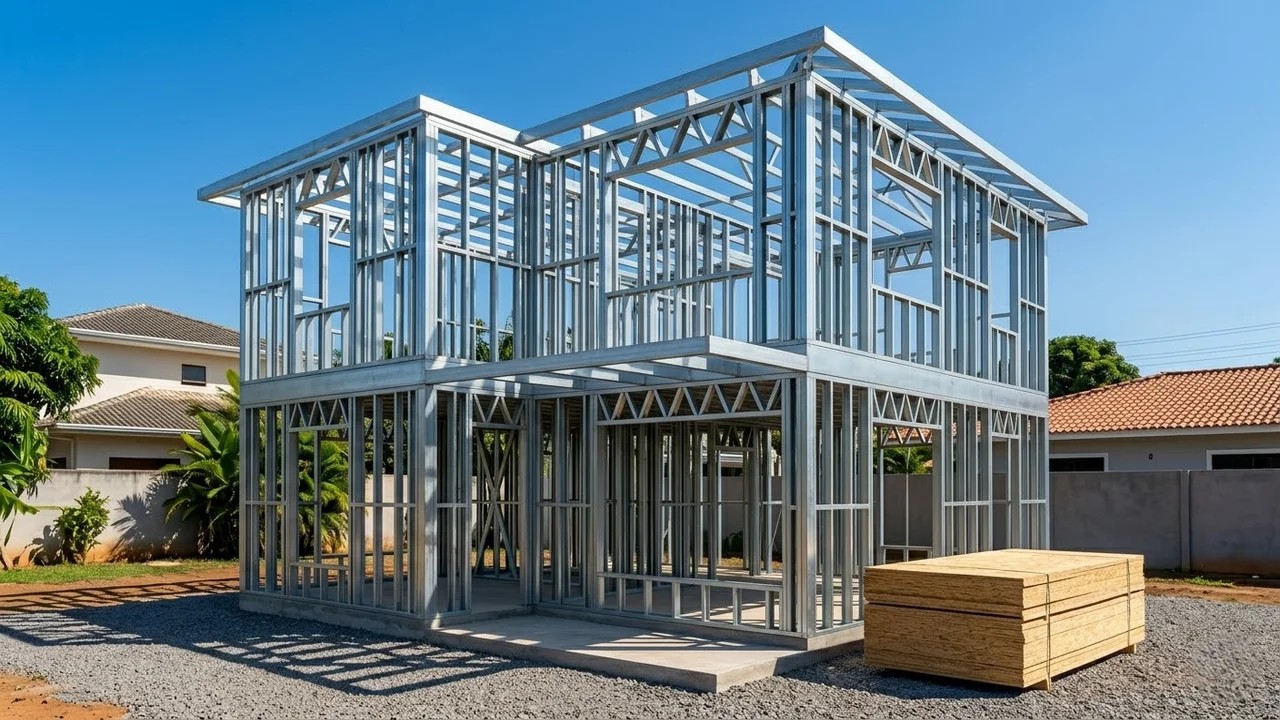 O sistema light steel frame é a solução exata para quem deseja erguer uma residência de alto padrão rapidamente. Esse método construtivo inteligente substitui a alvenaria, corta o cronograma em até metade do tempo e mantém o terreno totalmente livre da sujeira.