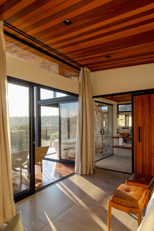 A materialidade é marcada pelo uso predominante da pedra moledo e da madeira, que confere identidade, robustez e diálogo com a paisagem. Pensada para hospedagem de curta permanência, a cabana oferece uma experiência sensorial completa, onde arquitetura, paisagem e conforto se unem para criar um refúgio contemporâneo integrado à natureza, estimulando a mente a uma pausa necessária.
