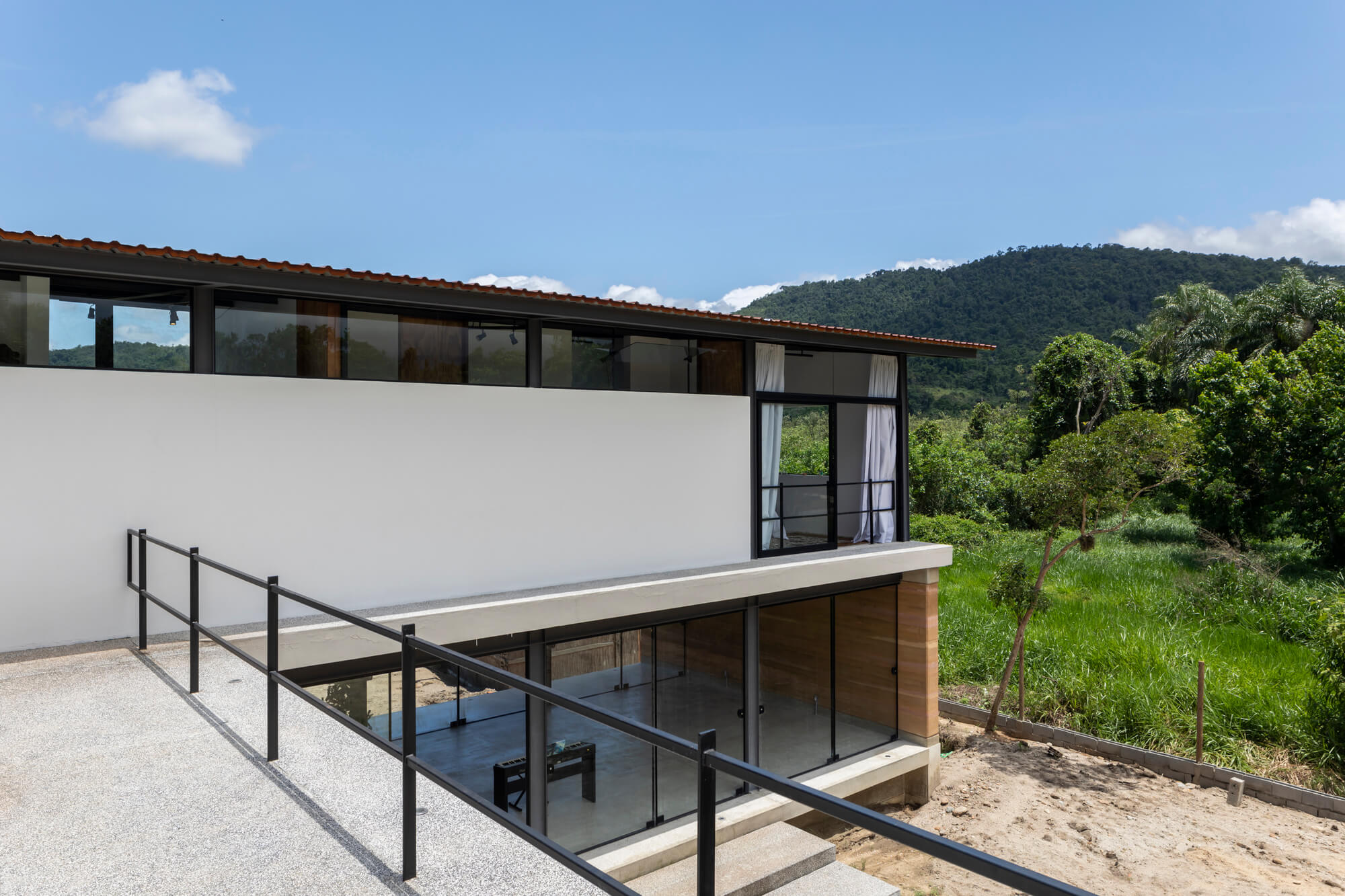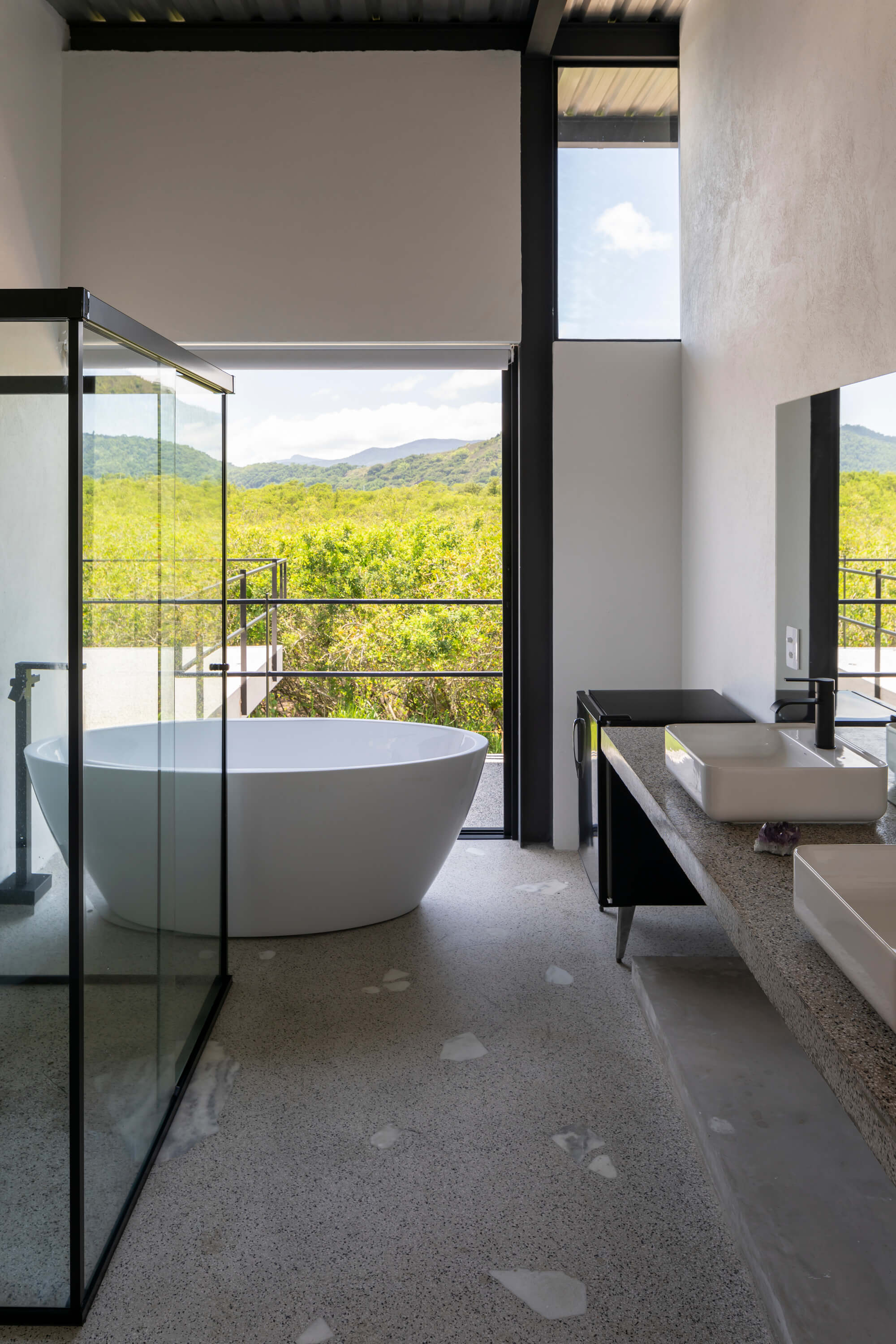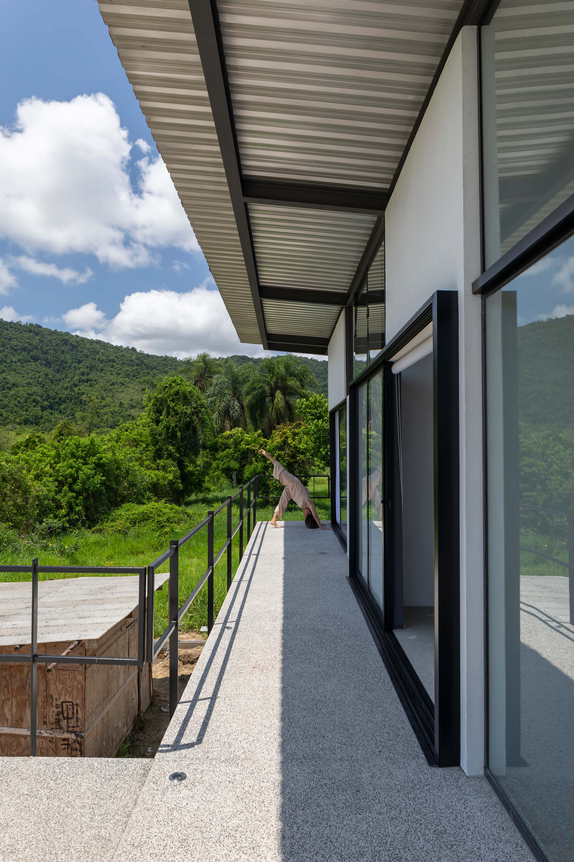 Nos pontos em que a vista para o mangue e para a Serra da Bocaina se abrem, o conjunto se transforma em moldura, enquadrando a paisagem sem competir com ela. E o aço atua como mediador entre corpo e natureza: marca o limite necessário sem fechá-lo — apenas o suficiente para sustentar e revelar a vista, em equilíbrio sutil entre contenção e transparência.