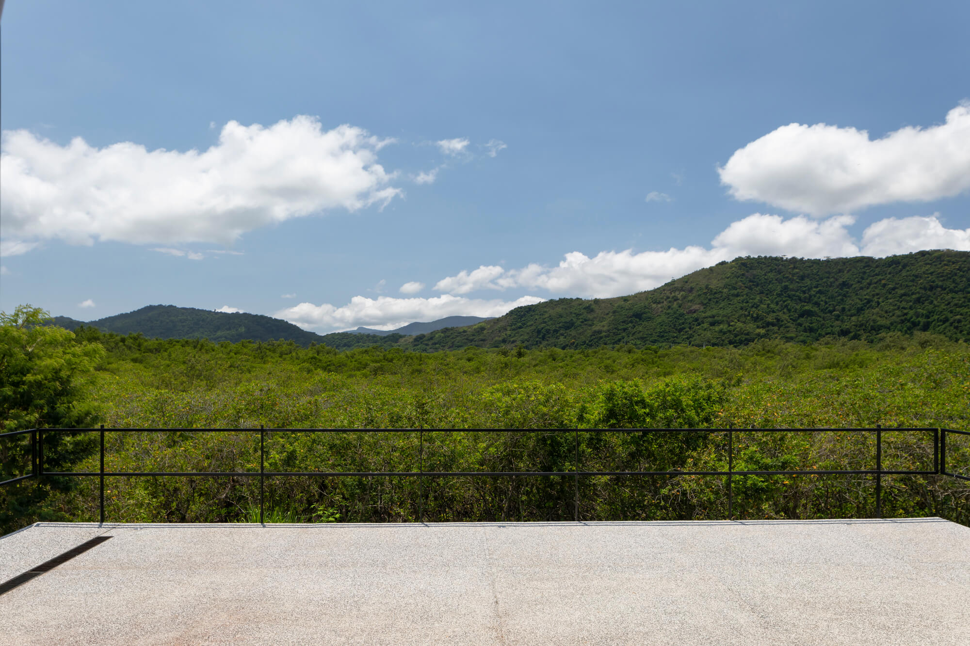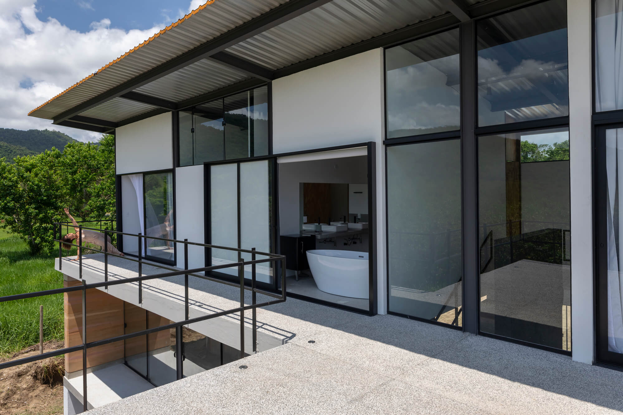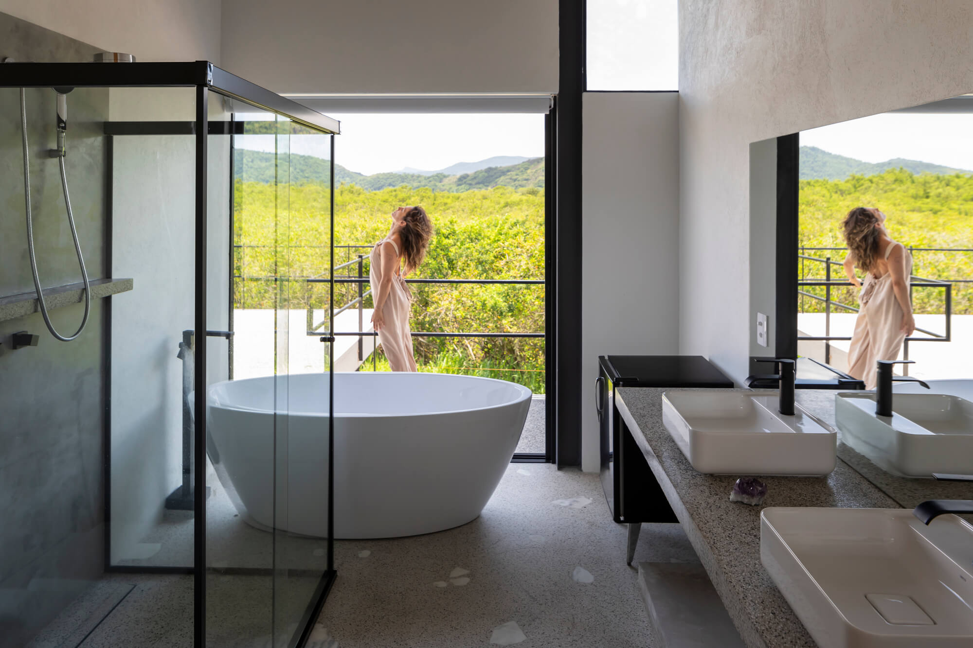 Nos pontos em que a vista para o mangue e para a Serra da Bocaina se abrem, o conjunto se transforma em moldura, enquadrando a paisagem sem competir com ela. E o aço atua como mediador entre corpo e natureza: marca o limite necessário sem fechá-lo — apenas o suficiente para sustentar e revelar a vista, em equilíbrio sutil entre contenção e transparência.