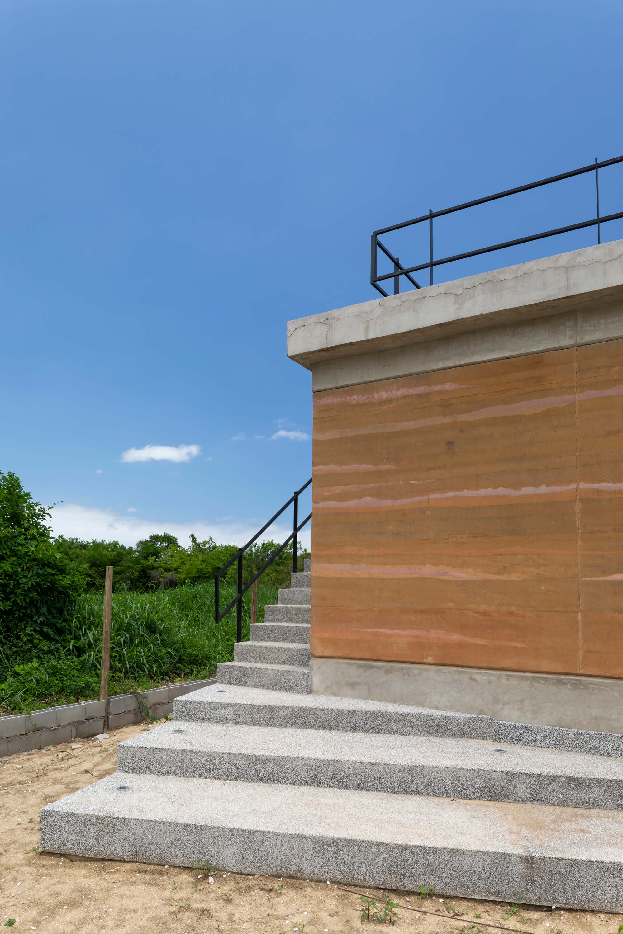 O concreto, nesse conjunto, atua como mediador entre materiais de naturezas distintas: amarra o edifício e permite que o aço e a taipa trabalhem em equilíbrio. Nas vigas de transição, chapas metálicas foram chumbadas durante a concretagem, garantindo continuidade estrutural e precisão nos encontros entre os sistemas. Essa solução assegura estabilidade e coerência visual.