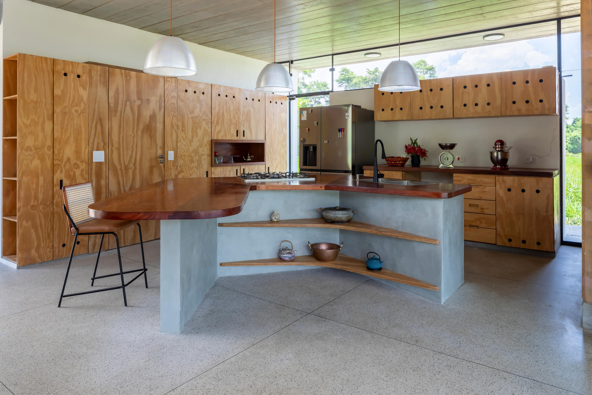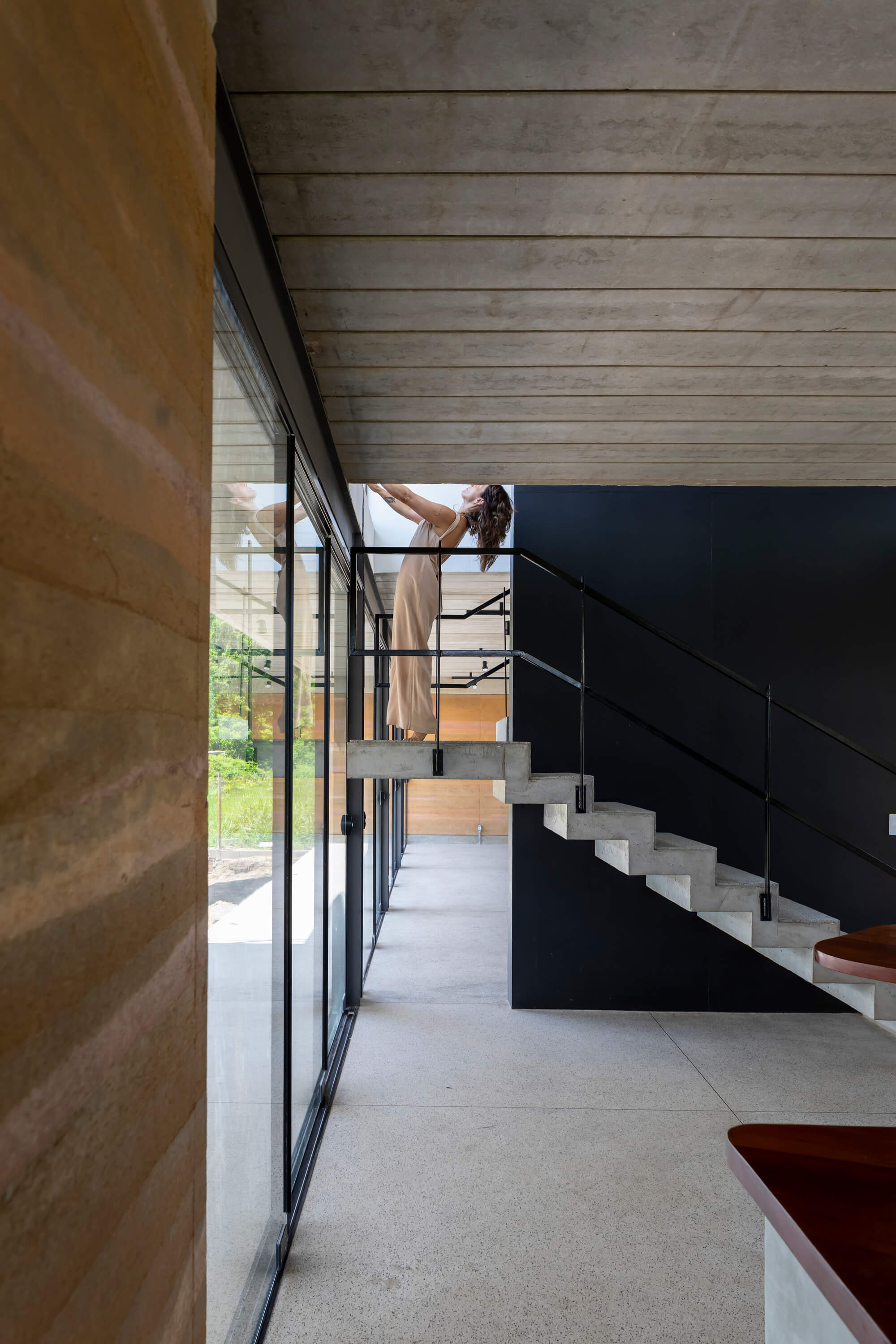 A precisão industrial contrasta com o trabalho artesanal da taipa e do granilite. “As peças metálicas, produzidas fora do canteiro, garantem agilidade e controle dimensional. Já os elementos executados em obra trazem a dimensão manual e o tempo do fazer”, explica a arquiteta. Essa convivência harmônica confere à Casa Palco uma dimensão mais humana — um equilíbrio entre solidez e leveza, entre a exatidão técnica e o manufaturado.