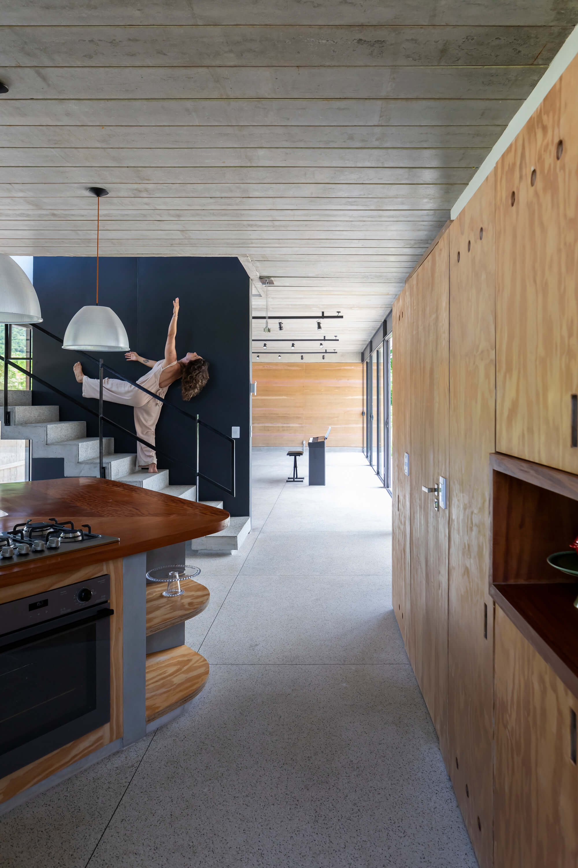 A Casa Palco foi se ajustando ao próprio tempo: enquanto o esqueleto metálico imprimia precisão e ritmo, os materiais moldados em obra seguiam o compasso da cura e do ofício. “Essa estratégia foi decisiva para otimizar o cronograma: enquanto outras etapas se prolongavam, a estrutura permitiu montagem rápida e encaixes exatos”, observa Kiti Vieira.