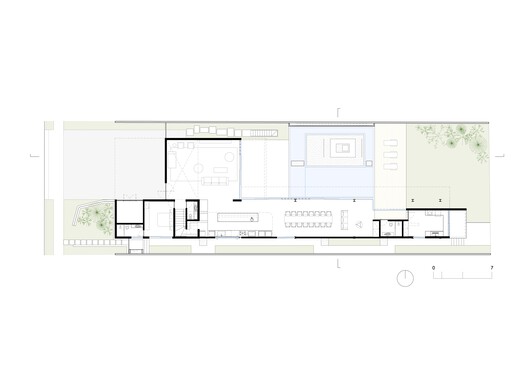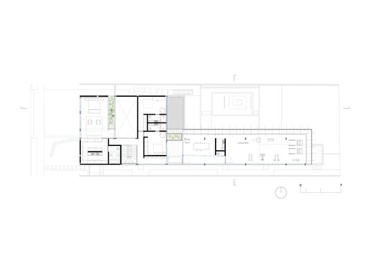 A estratégia evidencia, em ambos os momentos, uma relação mais introspectiva em relação à rua e vizinhança e, em contrapartida, de grande abertura e integração com a área de preservação no fundo do lote. O arranjo inicial, tem organização da área social no piso térreo (com uma suíte para visitas) e a área íntima no piso superior com o pé-direito duplo que confere integração visual para a circulação e jardim no piso superior. Estas decisões e virtudes são mantidas na segunda etapa do projeto.