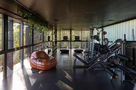 No andar superior, além dos quartos, há uma academia e um escritório, ambos protegidos da insolação do Norte por uma segunda pele de brises-soleils metálicos pivotantes. Esse espaço ocupou o terraço ajardinado previsto no projeto inicial e foi ampliado com a extensão da laje sobre a área da lavanderia e o canil.