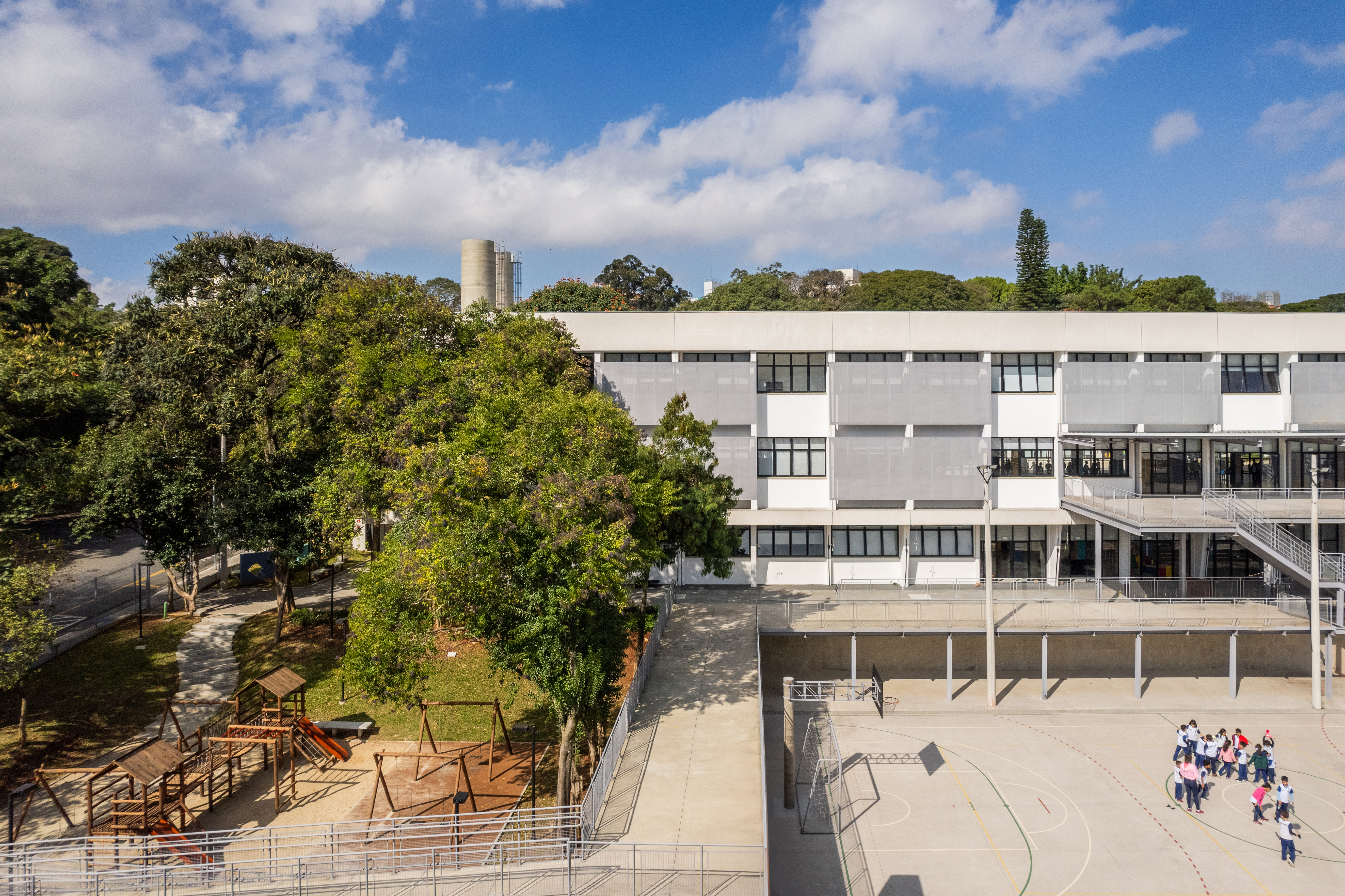 O projeto reposiciona o espaço aberto como parte do currículo de uma escola que funciona em período integral. Antes subutilizada, a grande área externa foi planejada para usos pedagógicos, recreativos e de descanso. Quadras, playgrounds, passarelas e o novo ginásio foram pensados como estruturas abertas, leves e permeáveis, capazes de criar sombras generosas e ambientes de convívio. As passarelas resolvem desníveis, organizam fluxos e desenham áreas de estar sob sua projeção, convertidas em pontos de encontro e múltiplas atividades.