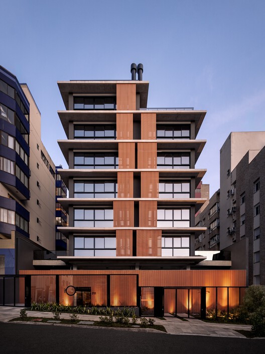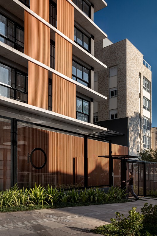 Descrição enviada pela equipe de projeto. O iO Petrópolis é o quarto empreendimento da linha Inside Outside, resultado da colaboração entre a OSPA e a incorporadora Wikihaus. Localizado em uma das áreas mais tradicionais de Porto Alegre, o projeto explora a condição urbana do bairro Petrópolis, marcada por ruas arborizadas e pela convivência equilibrada entre uso residencial e comércio de bairro.