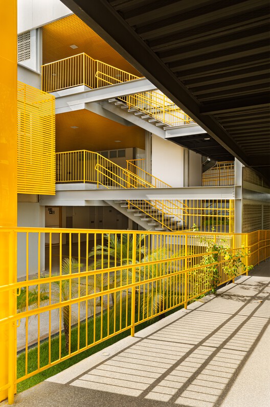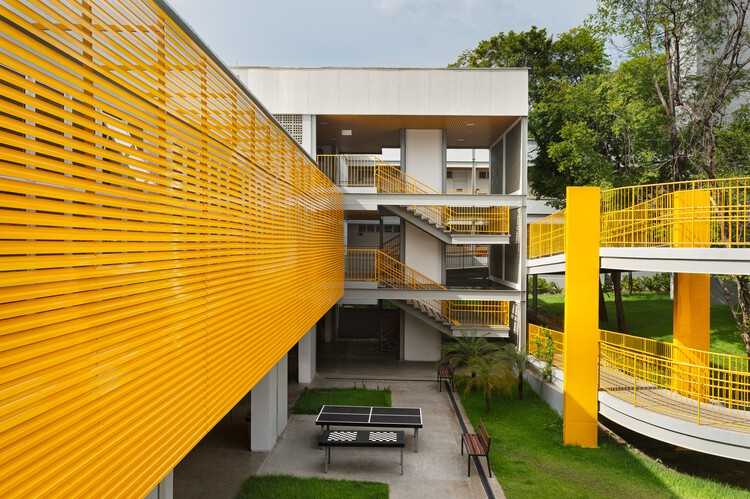 A proposta arquitetônica se estrutura a partir de um bloco principal escalonado em três níveis, organizado em torno de pátios naturalizados que incorporam a vegetação como elemento ativo do espaço. Esses pátios funcionam como núcleos de convivência, aprendizado e articulação, enquanto uma rampa sinuosa, implantada entre as árvores preservadas, garante acessibilidade universal e conduz o percurso de forma progressiva, em referência à promenade architecturale. O programa distribui-se em dois blocos — um educacional e outro esportivo — permitindo usos independentes e ampliando o papel do conjunto como infraestrutura pública. A linguagem arquitetônica, marcada por estrutura metálica modular e fechamentos em placas cimentícias claras, alia desempenho térmico e integração paisagística, com elementos em amarelo que evocam a identidade local.