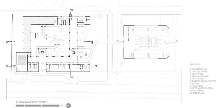 Complementando essa abordagem, o projeto incorpora estratégias de conforto ambiental e sustentabilidade, como cobogós, ventilação cruzada, fachadas duplas, brises solares, telhas termoacústicas, painéis fotovoltaicos e sistema de captação de águas pluviais. Como resultado, a escola se consolida como um organismo bioclimático que articula arquitetura, clima e paisagem em favor do bem-estar e da aprendizagem. Sua configuração permite o uso ampliado pela comunidade, reforçando seu caráter público e urbano, e estabelece um modelo de equipamento educacional comprometido com sustentabilidade, qualidade espacial e integração com o contexto.