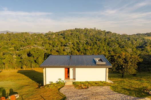 A fachada de acesso mais é fechada, garantindo privacidade e um percurso de entrada reservado, enquanto a fachada posterior se abre completamente para o deslumbre da paisagem totalmente intocada a sua frente - sensação reforçada pela inclinação da cobertura e pelas grandes aberturas.
