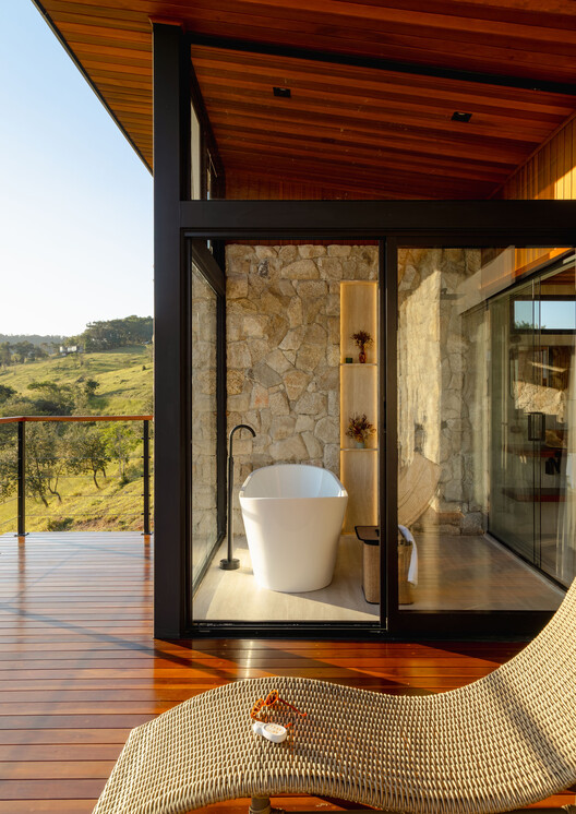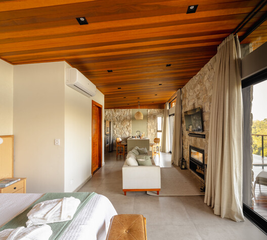 A materialidade é marcada pelo uso predominante da pedra moledo e da madeira, que confere identidade, robustez e diálogo com a paisagem. Pensada para hospedagem de curta permanência, a cabana oferece uma experiência sensorial completa, onde arquitetura, paisagem e conforto se unem para criar um refúgio contemporâneo integrado à natureza, estimulando a mente a uma pausa necessária.