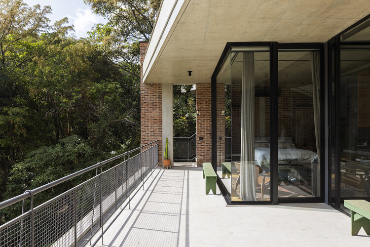 Descrição enviada pela equipe de projeto. A Residência AC ocupa o declive para se integrar com a mata nativa das serras de Nova Lima. A construção metálica leve da garagem providencia a sombra com menor presença na paisagem enquanto a construção em tijolos e concreto organiza o chão.