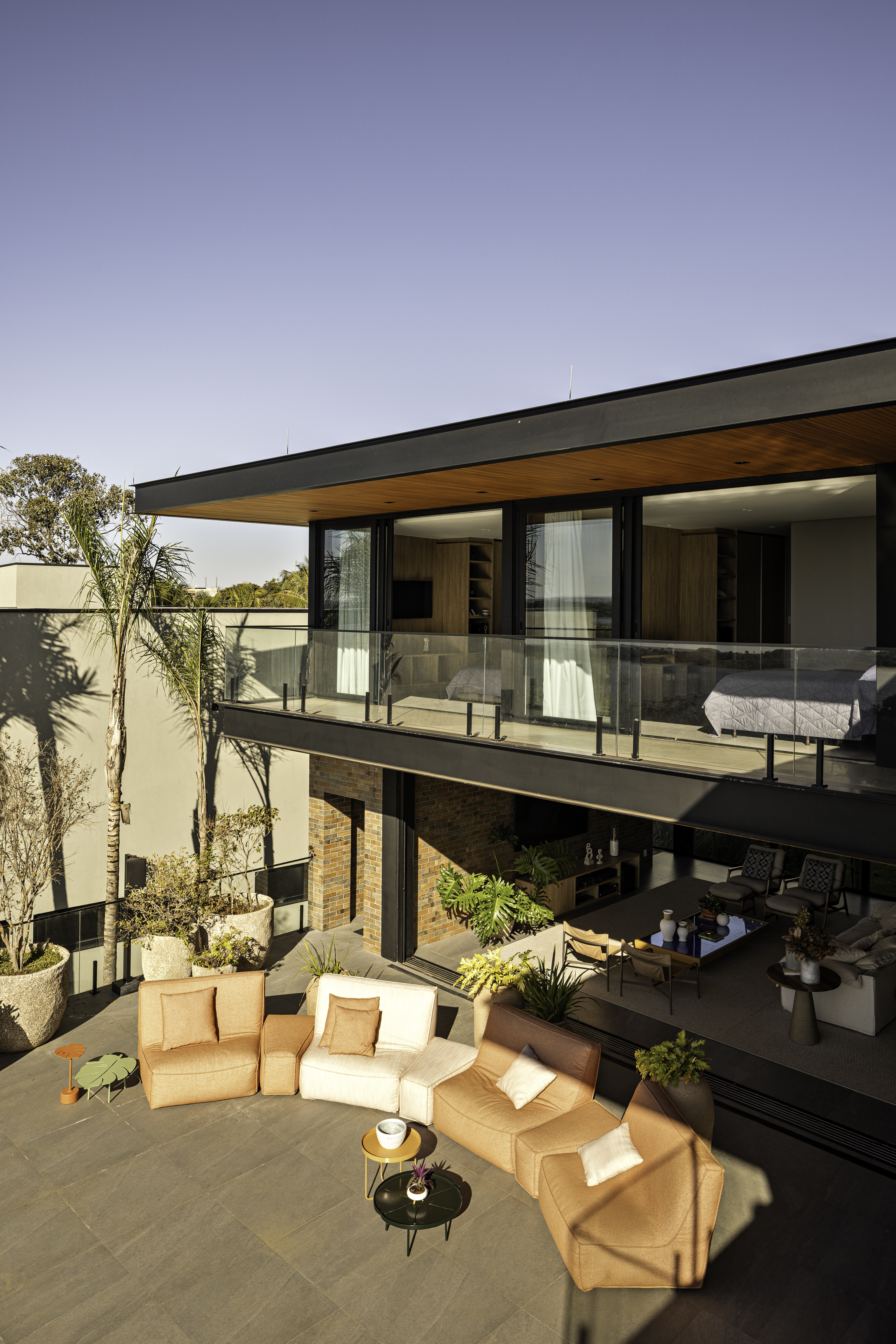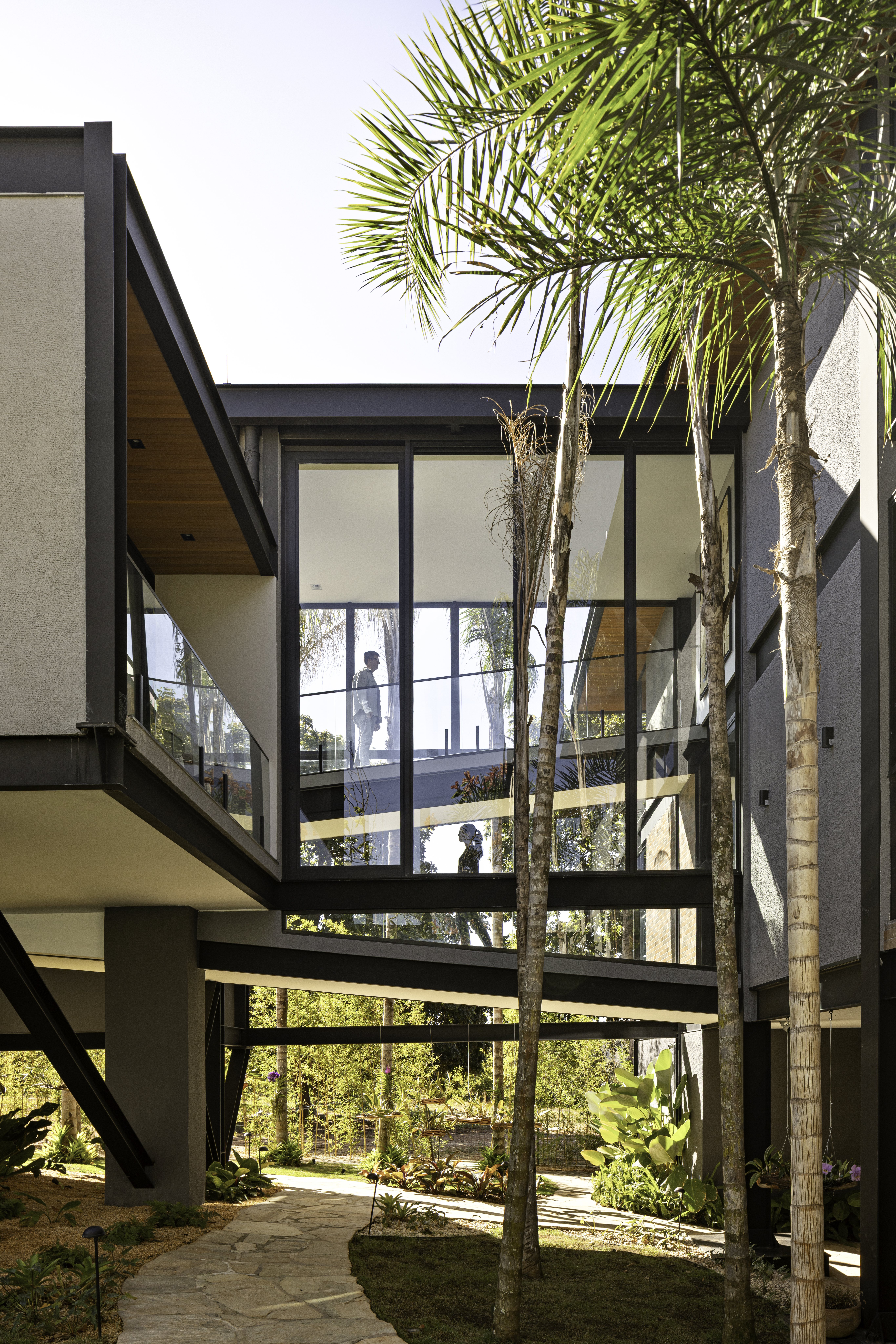 Os balanços e planos suspensos são o ápice. “A beleza está no equilíbrio entre a lógica do funcionamento da estrutura em aço e a leveza pretendida ao descolarmos a arquitetura da base”, observa o arquiteto. As vigas trianguladas, os apoios recuados e as varandas projetadas criam uma sensação total de liberdade.
