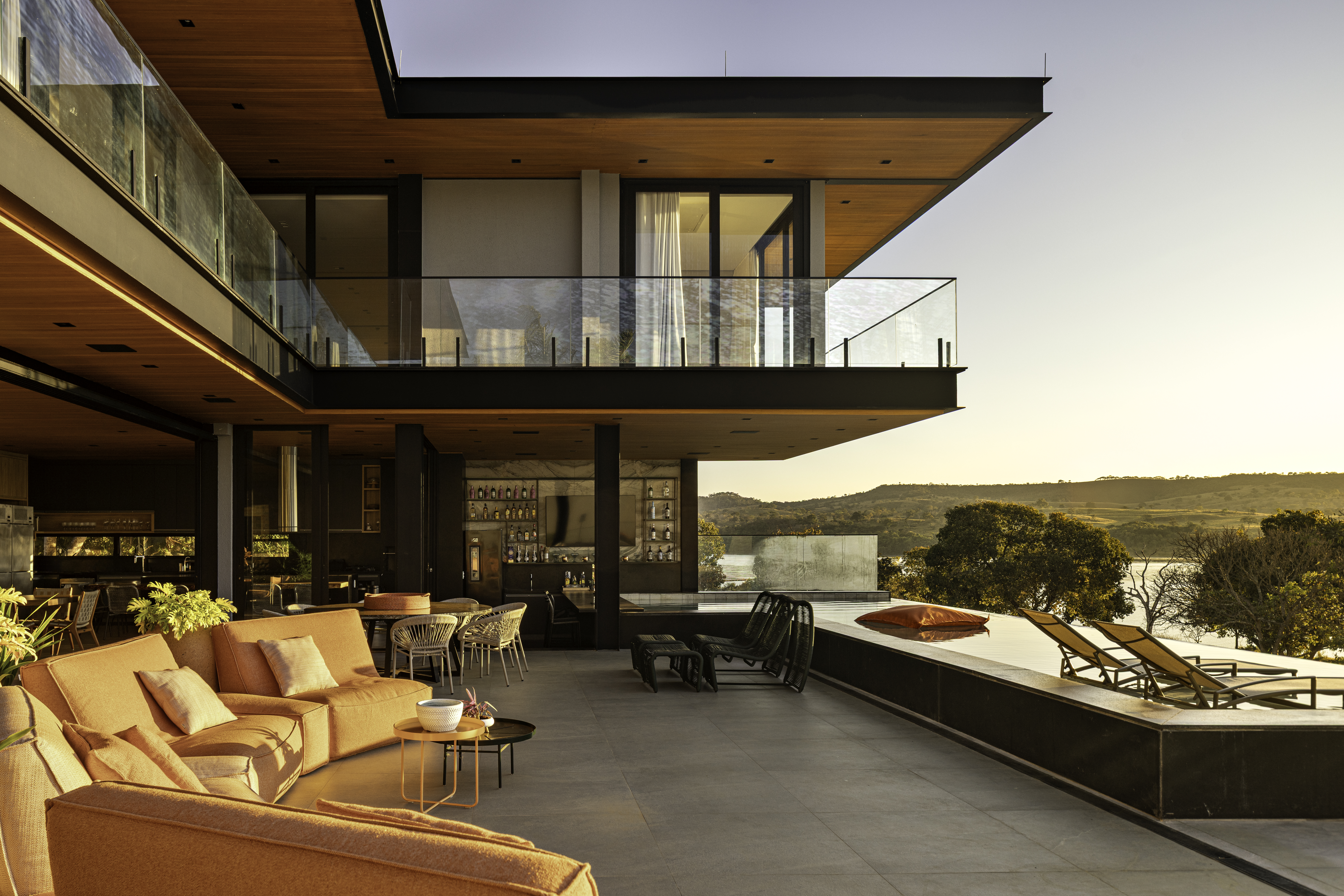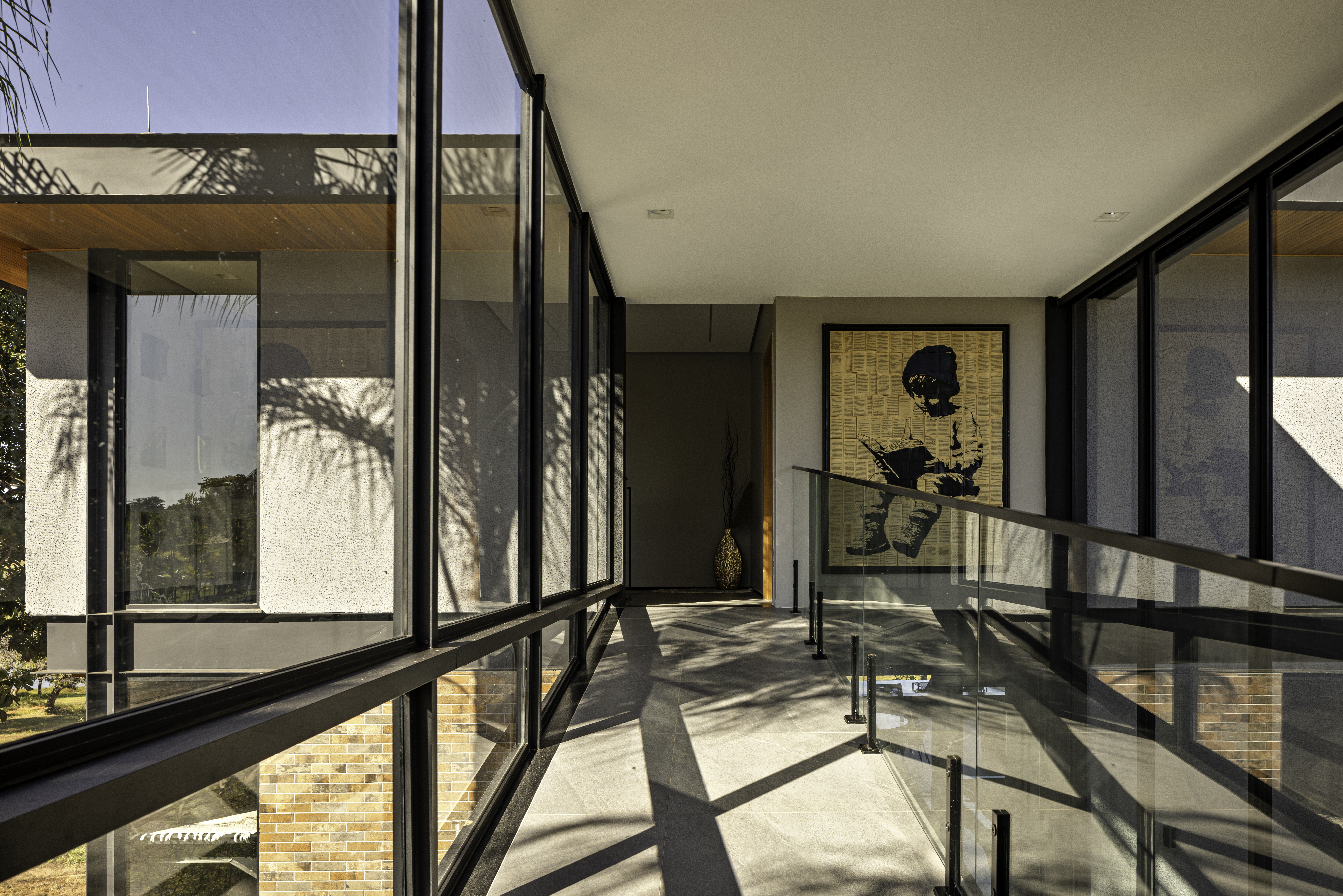 A transparência é o verdadeiro alicerce da Casa do Lago. Brises, passarelas e grandes panos de vidro dissolvem limites e constroem uma continuidade entre dentro e fora — onde o reflexo do lago se projeta sobre o aço leve. A estrutura metálica, esbelta e versátil, liberta o olhar e permite que o cerrado goiano se torne parte da arquitetura. “Por se tratar de uma casa de veraneio, o conceito sempre foi proporcionar ao usuário sensações de ambiência diferentes das que se tem na cidade”, explica Fábio Angelo Rafael.