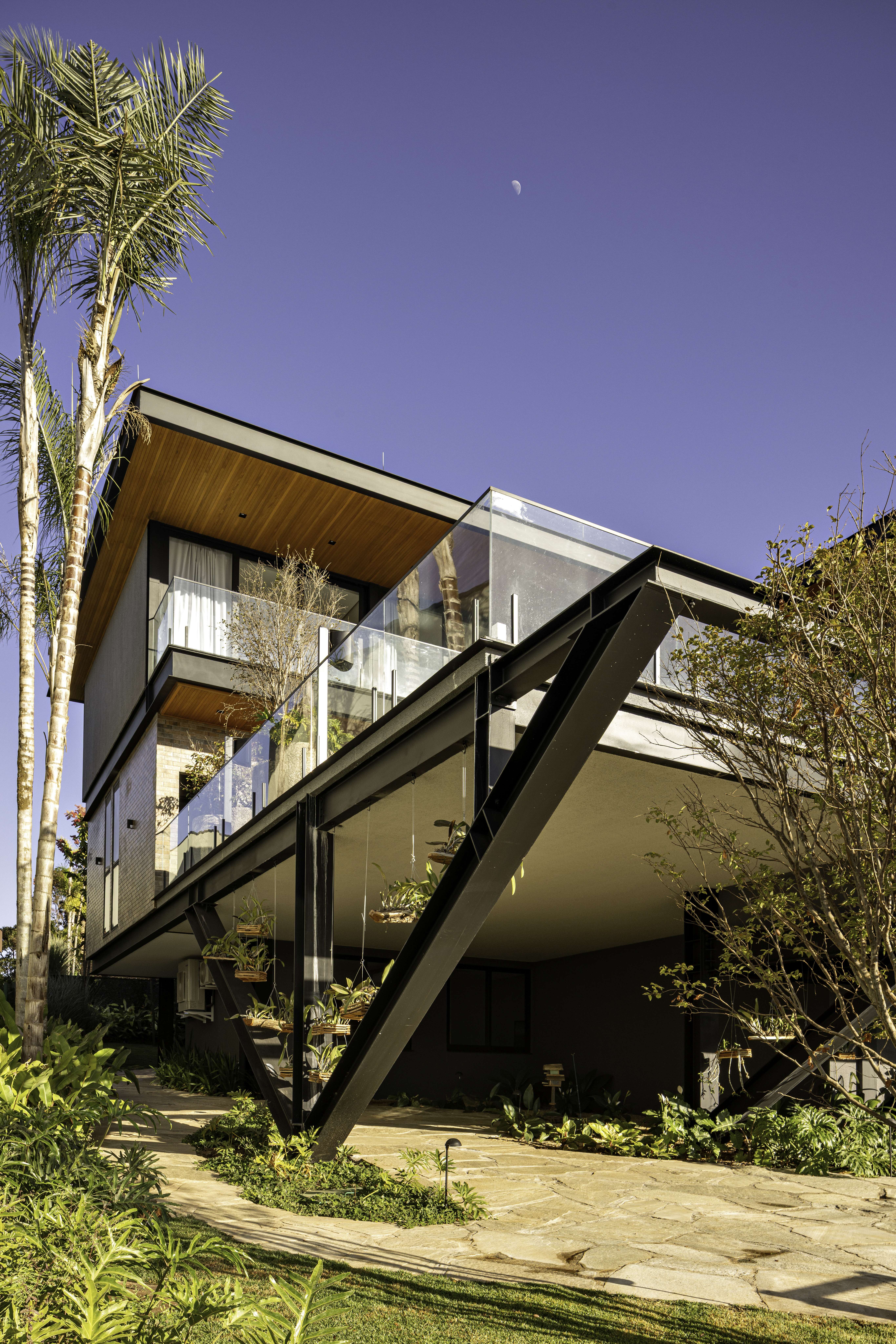 A espinha dorsal da casa é o sistema em aço. Segundo o arquiteto Fábio Angelo Rafael, a escolha antecede o desenho: “O cliente já havia tomado a decisão da utilização do conjunto estrutural metálico antes mesmo de nos conhecer”. Com a experiência dos profissionais envolvidos, essa imposição técnica se transformou em conceito.