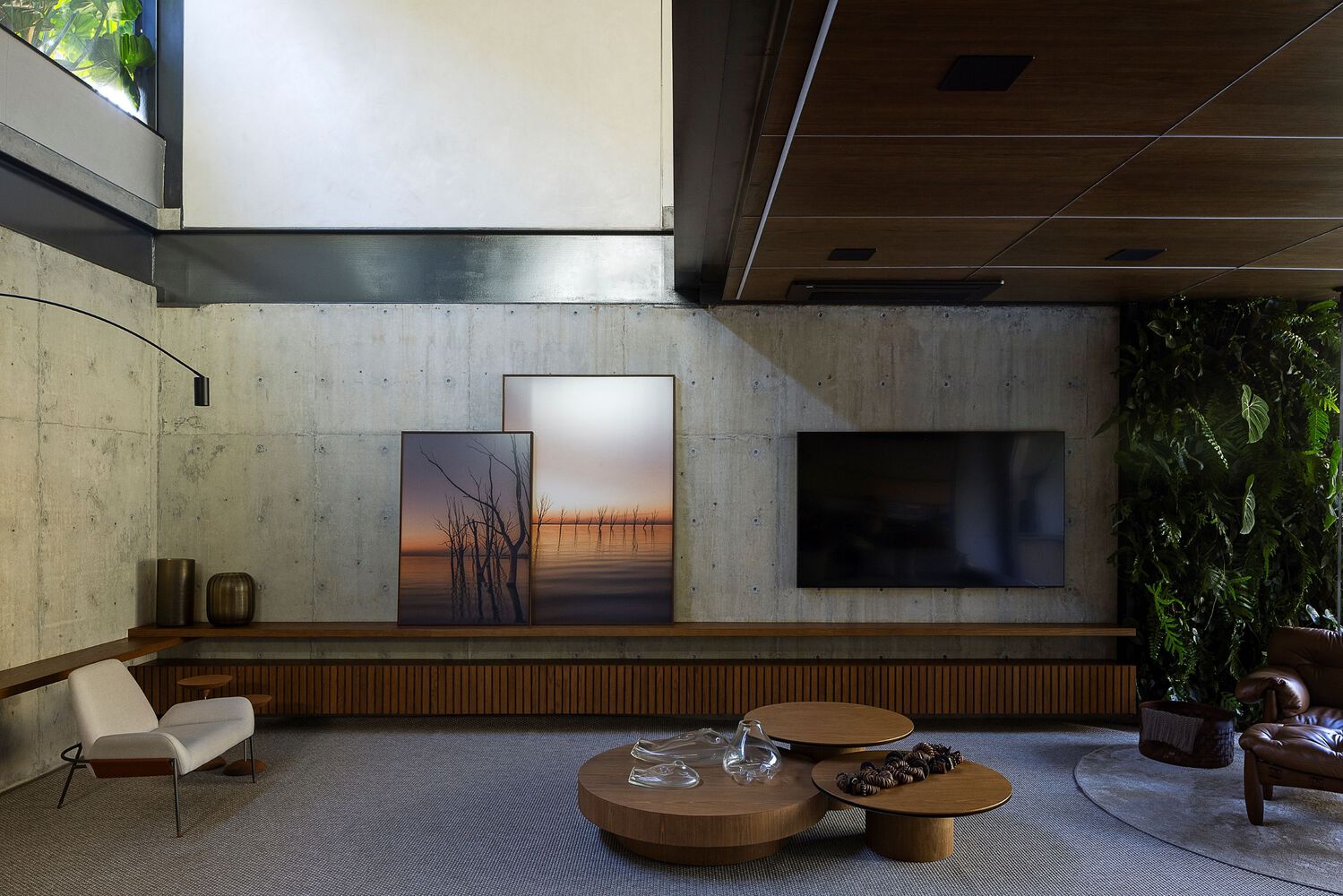 No andar superior, além dos quartos, há uma academia e um escritório, ambos protegidos da insolação do Norte por uma segunda pele de brises-soleils metálicos pivotantes. Esse espaço ocupou o terraço ajardinado previsto no projeto inicial e foi ampliado com a extensão da laje sobre a área da lavanderia e o canil.