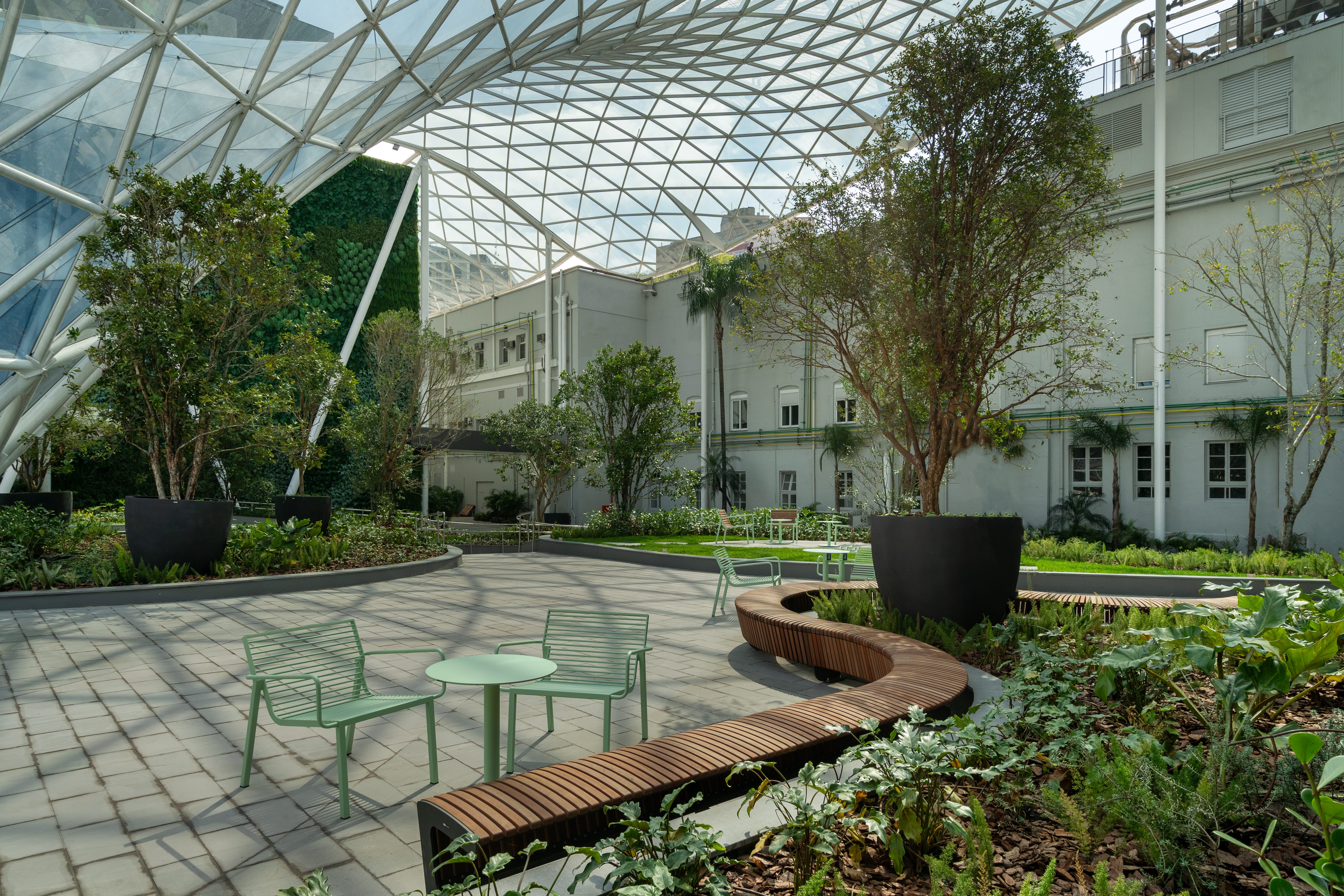 Um dos objetivos do projeto foi criar uma área externa animada e verde. A estrutura metálica influenciou diretamente essa criação. “A esbeltez do metal, viabilizada pela expertise de engenharia da sbp, permitiu que as áreas verdes e de convivência na praça da Rua da Saúde pudessem ser os verdadeiros pontos focais,” afirma a arquiteta.