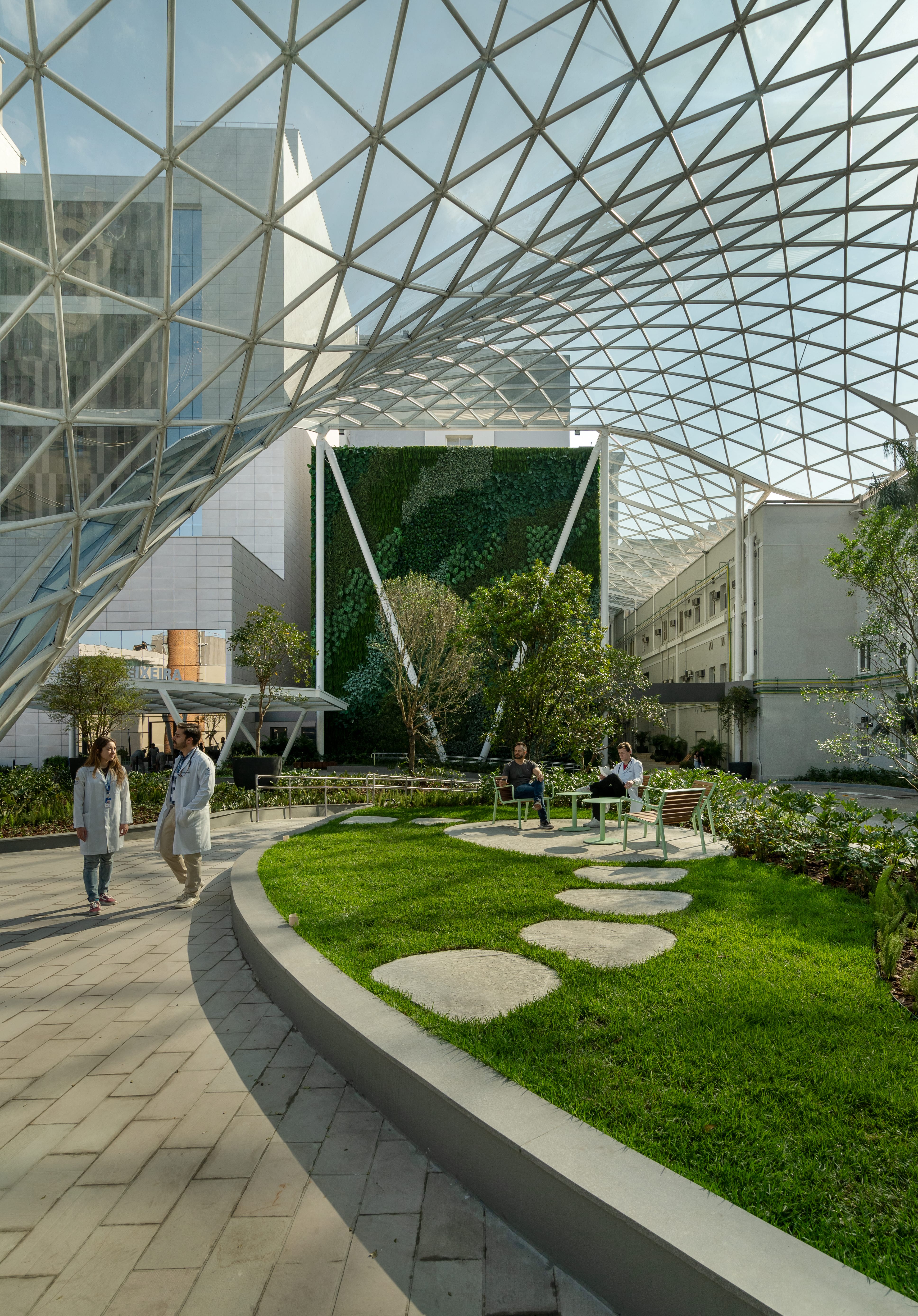 A utilização de aço e vidro na cobertura trouxe tanto funcionalidade quanto estética ao espaço. “O metal como elemento estrutural da grelha de cobertura possibilitou obter uma configuração extremamente esbelta, generosa em seus vãos, definindo uma área de proteção aos usuários do complexo hospitalar, além de gerar uma experiência de conforto e acolhimento nas áreas sob a cobertura,” explica a arquiteta. A transparência do vidro, combinada com a leveza do aço, transformou o ambiente de circulação em um espaço convidativo e protegido.