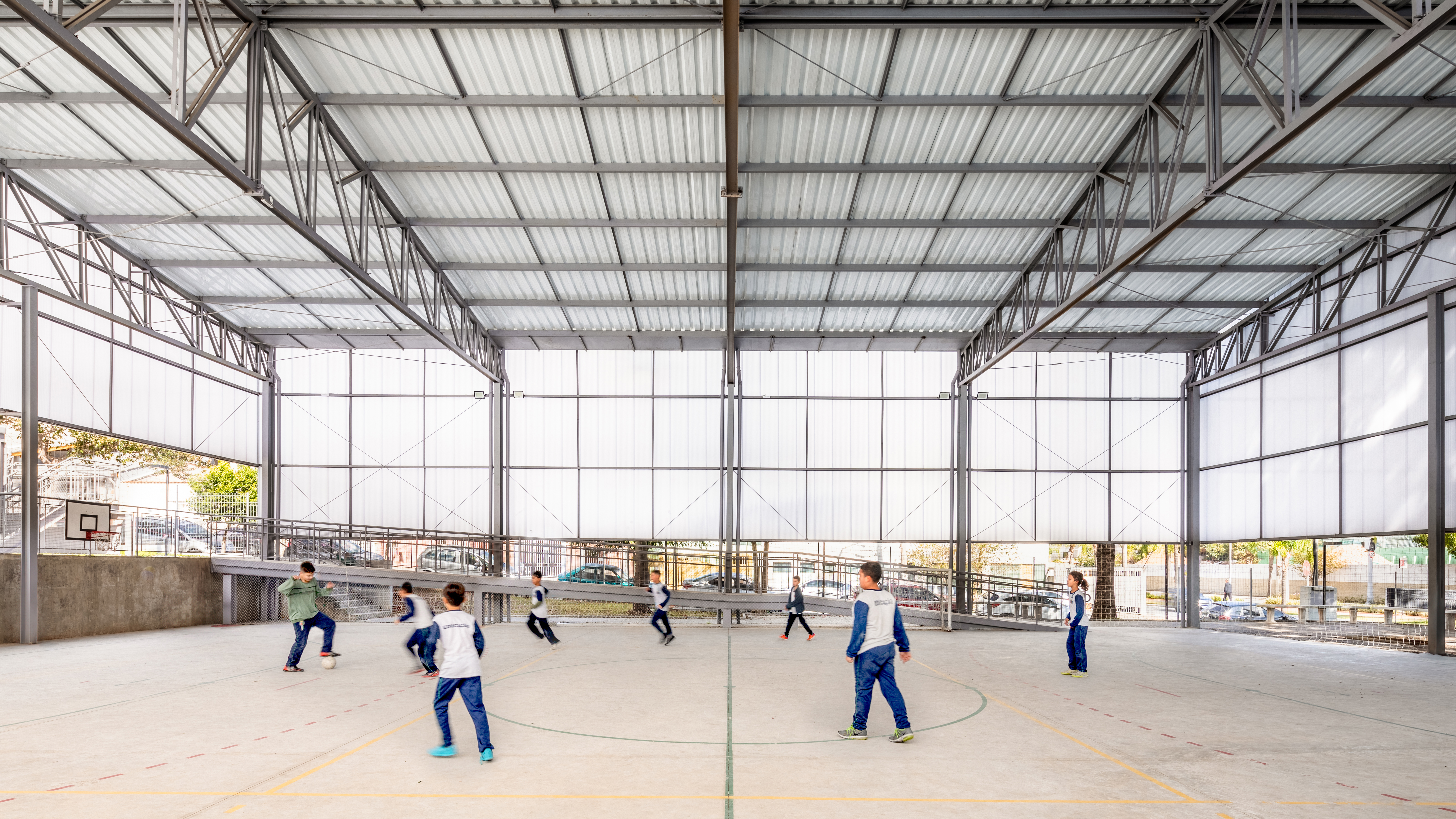 O projeto reposiciona o espaço aberto como parte do currículo de uma escola que funciona em período integral. Antes subutilizada, a grande área externa foi planejada para usos pedagógicos, recreativos e de descanso. Quadras, playgrounds, passarelas e o novo ginásio foram pensados como estruturas abertas, leves e permeáveis, capazes de criar sombras generosas e ambientes de convívio. As passarelas resolvem desníveis, organizam fluxos e desenham áreas de estar sob sua projeção, convertidas em pontos de encontro e múltiplas atividades.