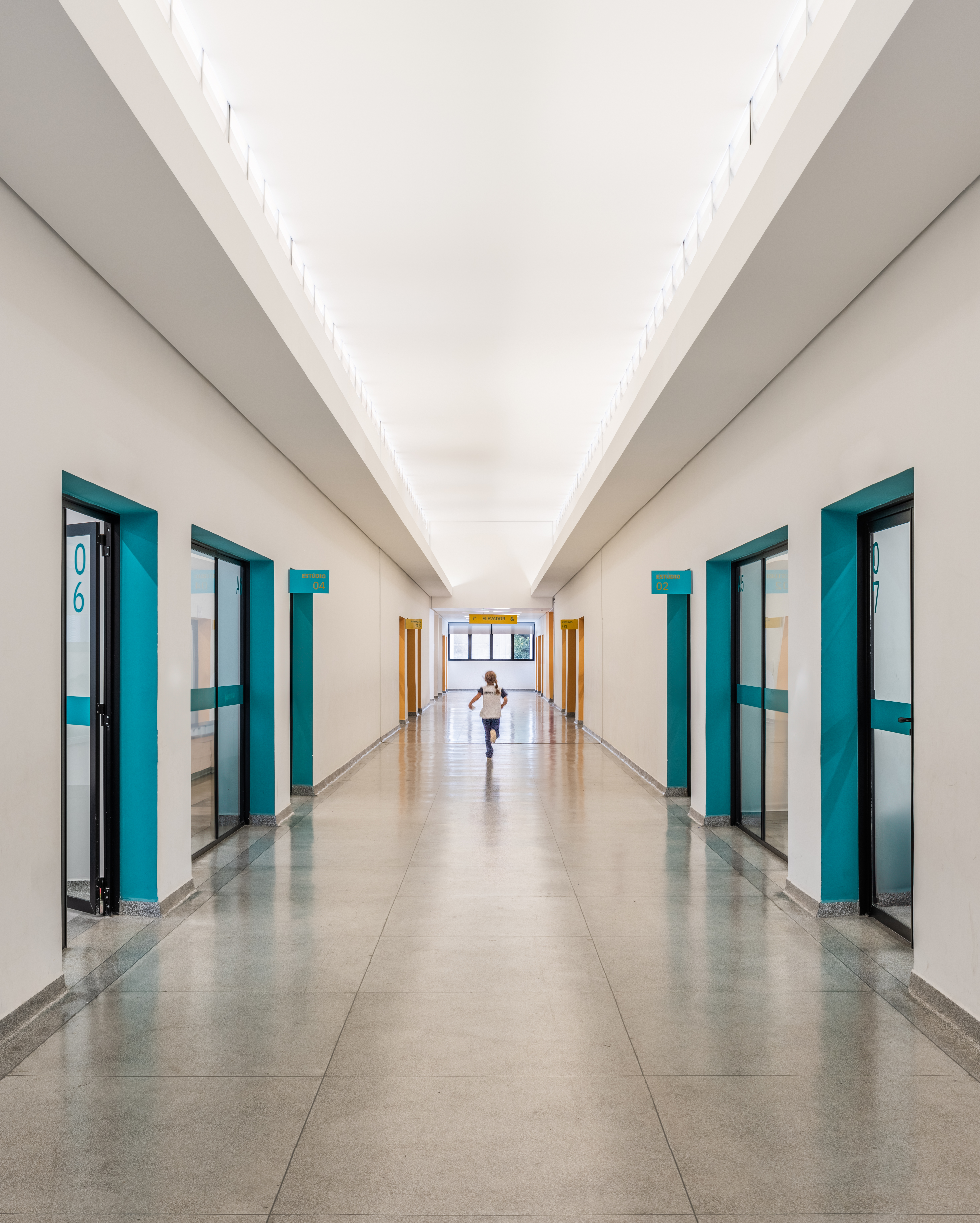 Readequar o edifício para Educação Infantil e Ensino Fundamental exigiu uma modernização capaz de reorganizar fluxos, incorporar acessibilidade e agregar novos usos. “A escolha pelo sistema estrutural metálico nesse retrofit aconteceu em função de vários benefícios — técnicos, estéticos e simbólicos — que foram se somando até que a solução ideal se revelasse”, destaca a arquiteta Carolina Penna.