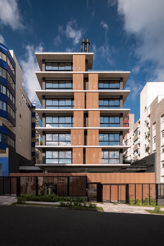Descrição enviada pela equipe de projeto. O iO Petrópolis é o quarto empreendimento da linha Inside Outside, resultado da colaboração entre a OSPA e a incorporadora Wikihaus. Localizado em uma das áreas mais tradicionais de Porto Alegre, o projeto explora a condição urbana do bairro Petrópolis, marcada por ruas arborizadas e pela convivência equilibrada entre uso residencial e comércio de bairro.