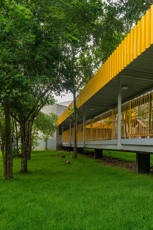 A proposta arquitetônica se estrutura a partir de um bloco principal escalonado em três níveis, organizado em torno de pátios naturalizados que incorporam a vegetação como elemento ativo do espaço. Esses pátios funcionam como núcleos de convivência, aprendizado e articulação, enquanto uma rampa sinuosa, implantada entre as árvores preservadas, garante acessibilidade universal e conduz o percurso de forma progressiva, em referência à promenade architecturale. O programa distribui-se em dois blocos — um educacional e outro esportivo — permitindo usos independentes e ampliando o papel do conjunto como infraestrutura pública. A linguagem arquitetônica, marcada por estrutura metálica modular e fechamentos em placas cimentícias claras, alia desempenho térmico e integração paisagística, com elementos em amarelo que evocam a identidade local.
