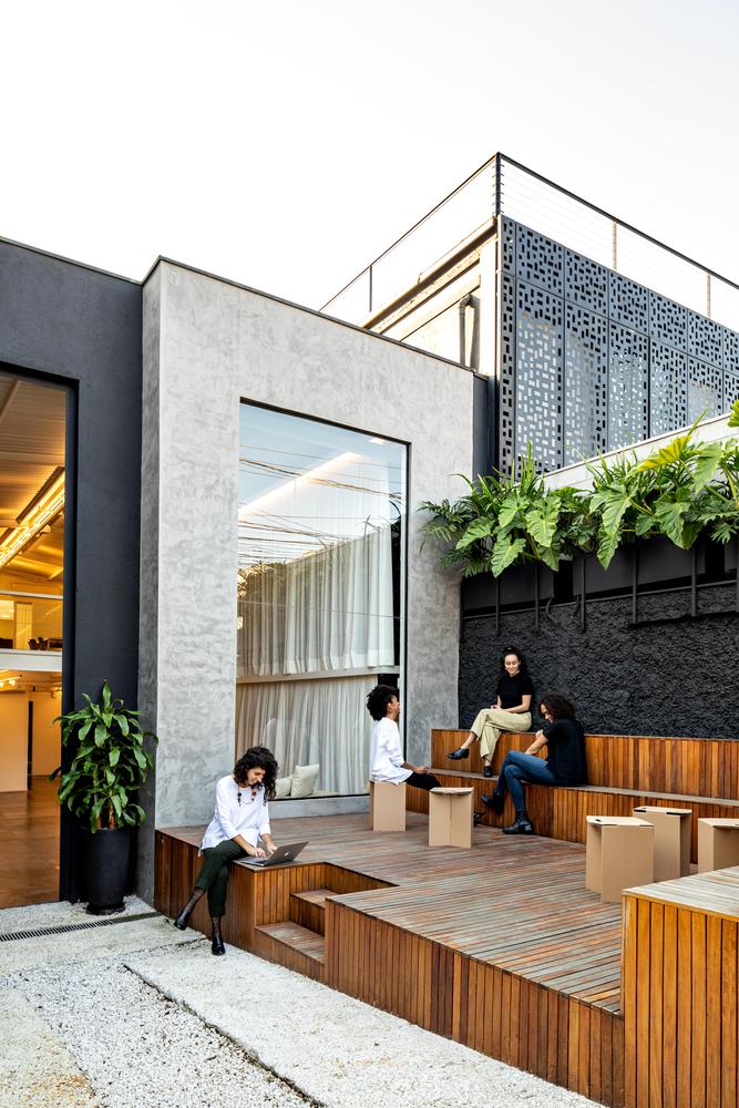 A escolha da madeira em compensado de Paricá nos móveis, do cimento queimado e da madeira do piso, do granito cinza no café, das fibras naturais dos tapetes, das cortinas off-white, da laje do mezanino e da cobertura pintadas de branco proporciona um ambiente convidativo e aconchegante. Visando o diálogo com a comunidade, foi desenhado um banco de madeira que se estende no limite do lote com a rua e se volta para o passeio, convidando as pessoas que ali transitam diariamente, ou os colaboradores da agência, a se sentar, tomar um café ou esperar a carona. Ainda na área externa da casa, um grande deck a céu aberto faz uma transição gradual entre externo e interno e fica disponível para reuniões informais e eventos espontâneos. O térreo abriga um grande lounge e um café aberto ao público posicionado na entrada da casa. Há uma sala de criação que pode facilmente se transmutar em uma pista de dança e um jardim interno que garante a luz natural e o contato dos colaboradores e clientes com a vegetação, possibilitando também uma troca de ar direta entre área interna e externa, elemento fundamental para o bem-estar coletivo. Para todos os espaços foram pensados locais para receber plantas de diferentes portes, tornando o ambiente mais agradável.