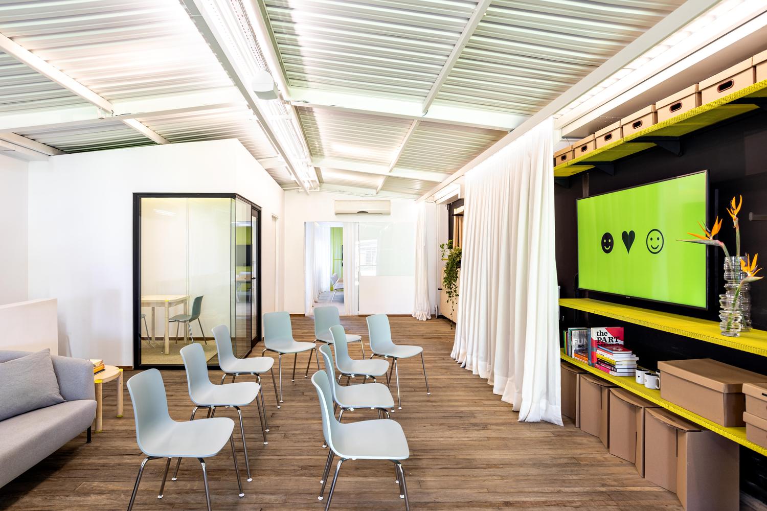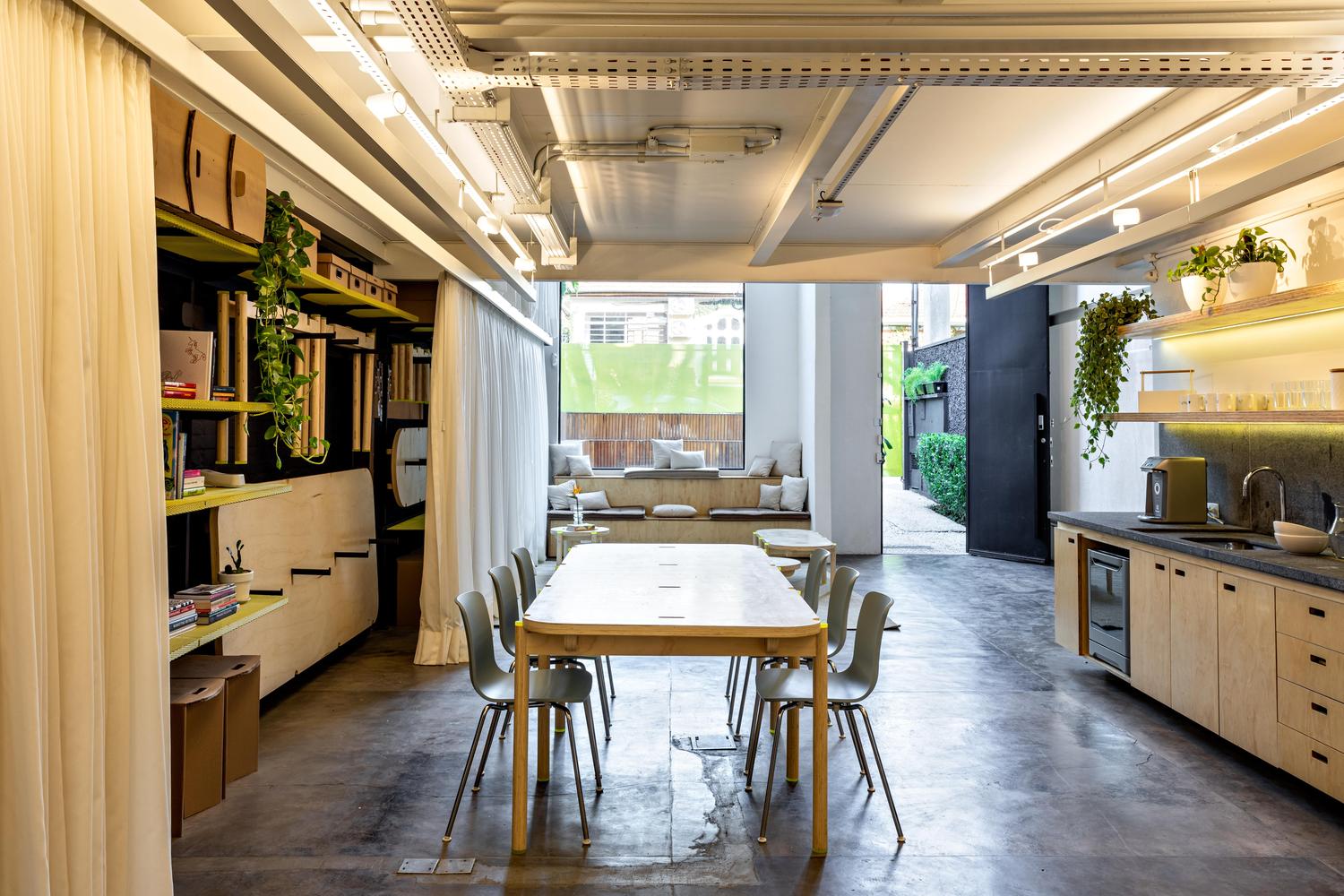 O elemento protagonista é a estante que se estende entre térreo e mezanino e, a partir do posicionamento de cortinas, possibilita criar o cenário ideal para cada um dos diferentes usos. Desenhada com prateleiras leves produzidas em chapa metálica perfurada, painéis de cortiça e suportes estrategicamente posicionados, a estante pode abrigar o material de apoio necessário ao cotidiano e aos eventos e o mobiliário desmontável desenhado especialmente para o projeto. Para pequenas e médias reuniões, em que é necessário o uso de notebooks e cadernos, as mesas permanecem montadas. Para as grandes reuniões, eventos, palestras e aulas é possível configurar pequenos auditórios, no térreo e mezanino. Os equipamentos de mídia e de vídeo transferência foram estrategicamente posicionados para apoiar essas atividades. O projeto, seguindo o conceito de adaptabilidade, também prevê espaços mais privativos, como uma sala de reunião para até 10 pessoas e um phone booth em cada pavimento para realização de ligações ou reuniões online.
